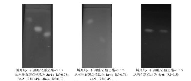 從2.1實(shí)驗(yàn)結(jié)果可以看出3a、3b、4a和4b清除DPPH自由基效果較顯著,將此四部分進(jìn)一步經(jīng)薄層層析制備分離,3a部分用石油醚/乙酸乙酯=5︰1展開得到樣品3a-1.3b部分用石油醚/乙酸乙酯=1︰2展開得到樣品3b-2和3b-3.4a部分用氯仿/甲醇=4︰1展開得到樣品4a-4和4a-5.4b部分用氯仿/甲醇=1︰7展開得到樣品4b-6,共六個(gè)樣品,它們的薄層層析圖及Rf值見圖2。