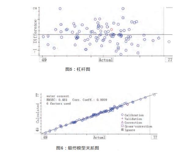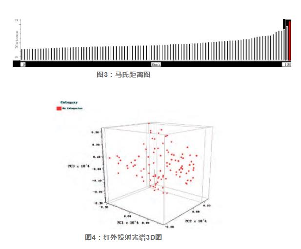 在原始模型基礎(chǔ),分別對其進行一階導(dǎo)數(shù)法及二階導(dǎo)數(shù)法預(yù)處理,根據(jù)模型相關(guān)系數(shù)的高低來判斷模型優(yōu)劣,其中使用二階導(dǎo)數(shù)法得到模型的相關(guān)系數(shù)為0.9062,RMSEC值為2.49。隨后通過異常光譜的剔除原理及方法,對原始樣本的全部光譜圖進行優(yōu)化處理,去掉偏離樣本中心的光譜,此時模型相關(guān)系數(shù)提高到0.9634,均方差值降至1.59。將剔除異常光譜所得的模型采用馬氏距離優(yōu)化的方法進行優(yōu)化,得到馬氏距離圖,如圖3所示。將圖中誤差超過1.5000的數(shù)據(jù)從右到左依次剔除,將所得模型通過3D分布圖法進行優(yōu)化,得到其空間分布圖,如圖4所示。選擇好合適的角度,將其遠離中心距離的異常樣本點標記出來,剔除這部分樣本進行模型優(yōu)化。最后通過杠桿法優(yōu)化模型,將杠桿值和學生化殘差較大的樣本定為異常樣本。根據(jù)TQ軟件中的診斷功能,軟件自動合成的杠桿圖如圖5所示,此圖方便發(fā)現(xiàn)遠離聚集區(qū)的異常樣本。最終所得最佳模型的相關(guān)系數(shù)為0.9959,RMSEC為0.481。