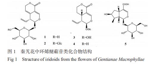 環(huán)烯醚萜苷類有效成分是秦艽組植物花中常含的主要成分。賈娜等應用多種多樣分離出來方式對陜西省產(chǎn)尖葉秦艽花中的成分開展系統(tǒng)軟件分離出來獲得好幾個化學物質(zhì),并使用多種多樣波譜學方式,加上標準品對比,從這當中鑒別出龍膽苦苷(1)。李雨蔚等從西藏自治區(qū)秦艽花的95%酒精提取液中澳分離出來獲得4個環(huán)烯醚萜苷類物質(zhì),各自為6'-O-β-D-葡萄糖水基龍膽苦苷(2)、獐牙菜苦苷(3)、獐牙菜苷(4)和馬錢苷酸(5),在其中化學物質(zhì)1~4為裂環(huán)環(huán)烯醚萜苷類物質(zhì),5為環(huán)烯醚萜苷類物質(zhì)。秦艽花中環(huán)烯醚萜苷類成份見表2,構(gòu)造見圖1。