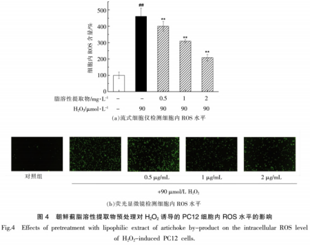 為了更好地進(jìn)一步研究脂溶性提取液能不能合理地抑止細(xì)胞壞死,運(yùn)用AnnexinV-FITC/PI開展上色,經(jīng)流式細(xì)胞術(shù)檢驗(yàn)細(xì)胞壞死率(圖6a)。如圖所示6b所顯示,與空缺對(duì)照實(shí)驗(yàn)(8.14%)對(duì)比,H202解決明顯提高了細(xì)胞壞死率(23.66%),經(jīng)朝鮮薊脂溶性提取液預(yù)備處理后,PCI2體細(xì)胞的細(xì)胞凋亡獲得明顯抑止。在其中,歷經(jīng)2mg/L脂溶性提取液預(yù)維護(hù)后,細(xì)胞壞死率減少至8.75%。