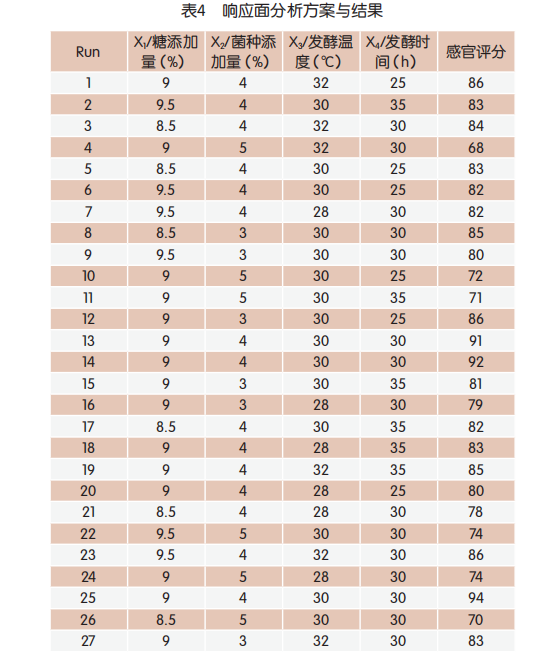 依據(jù)單要素實驗的結(jié)果,創(chuàng)建Box-BehnkenDesign核心組成設(shè)計方案實驗實體模型,根據(jù)線性擬合二次方程測算最好加工工藝組成,選擇糖加上量、菌苗加上量、發(fā)酵溫度、發(fā)酵時間開展4要素3水準(zhǔn)響應(yīng)面分析,結(jié)果見表4。