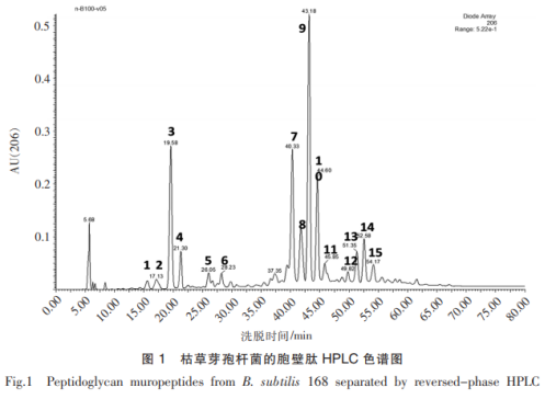 肽聚糖是由N-乙酰葡糖胺(GlcNAc)、N-乙酰胞壁酸(MurNAc)及肽模塊構(gòu)成的聚合體,肽鏈碳水化合物的構(gòu)成主要是Ala、Glu、DAP,也有少量的Gly,大部分G-及產(chǎn)孢菌具備meso-DAP殘基。對枯草枯草芽孢菌植物細(xì)胞的肽聚糖選用變?nèi)芫孛附?,其精彩片段?jīng)硼氫化鈉復(fù)原后,選用HPLC開展胞壁肽的分離出來,獲得胞壁肽譜圖(圖1)。從圖上能夠看得出,枯草枯草芽孢菌的胞壁肽關(guān)鍵帶有15個胞壁肽成分,關(guān)鍵的峰八個。肽聚糖歷經(jīng)變?nèi)芫孛附夂?,產(chǎn)生以GlcNAc-MurNAc-L-Ala-D-Glu-mesoDAP為基本上結(jié)構(gòu)單元的二聚體、三聚體、四聚體等。這種胞壁肽成分分子質(zhì)量越大,保存期越長,因而,單個總體目標(biāo)峰出峰時間較早。Atrih等對枯草枯草芽孢菌的胞壁肽開展剖析,獲得3八個成分,在20min保存期內(nèi)的前4個成分均為胞壁肽單個,某些成分官能團(tuán)發(fā)生氟苯化而保存期不一樣。此結(jié)果也與文獻(xiàn)資料報導(dǎo)相一致。