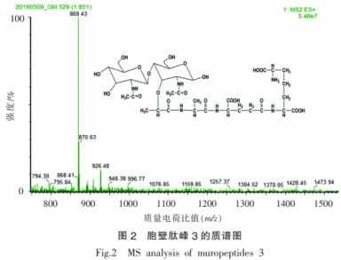 對每一個成分單峰搜集,除鹽后開展ESI-MS剖析,根據(jù)對3號峰的MS剖析(圖2),其分子離子[M] 為m/z869,伴峰:[M H] 為m/z870,該分子質(zhì)量構(gòu)成與GlcNAc-MurNAc-L-Ala-D-Glu-mesoDAP(標(biāo)準(zhǔn)偏差:869.9)一致,伴峰的產(chǎn)生是由于在共價鍵方式下,目地精彩片段會在水解全過程里加一個氫,分子質(zhì)量提升。因而,峰3即是總體目標(biāo)物二糖三肽(GM-TriDAP),其結(jié)構(gòu)示意圖如圖2所顯示。