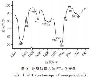 對胞壁肽3號峰單峰搜集,低溫干燥后開展傅里葉變換紅外線定量分析,紅外光譜圖見圖3所顯示,從圖上能夠看得出,在兩個地區(qū)存有強(qiáng)消化吸收,一個是~3447cm-1,另一個是~1020cm-1。肽鏈的好多個特點(diǎn)帶包含氟苯A帶(~3500cm-1)、氟苯Ⅰ帶(1600~1700cm-1)和氟苯Ⅱ帶(1510~1580cm-1)。氟苯A帶主要是N-H伸縮式震動,對共價鍵十分比較敏感;氟苯Ⅰ帶是肽鏈的首要特點(diǎn)帶,主要是C=O和C-N的升縮震動;而氟苯Ⅱ帶主要是N-H平行面變角震動,及其C-N和C-C的升縮震動。糖環(huán)的特點(diǎn)峰集中化在800cm-1~1200cm-1中間,包含C-OH的升縮震動和糖苷鍵C-O-C的震動累加消化吸收數(shù)據(jù)信號。峰3的紅外光譜分析的消化吸收峰分類見表1所顯示,從表格中還可以看得出,胞壁肽3號峰包含糖肽的典型性官能團(tuán)震動特點(diǎn),一個是肽鏈的氟苯消化吸收帶,包含3447cm-1的氟苯A帶、1647cm-1的氟苯Ⅰ帶;另一個是在1200~800cm-1,1020cm-1是糖環(huán)及其糖苷鍵的特點(diǎn)消化吸收峰。因而,胞壁肽3號峰具備典型性的糖肽結(jié)構(gòu)類型。