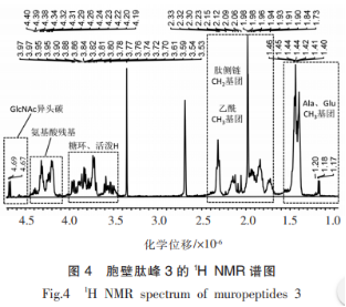 氫譜是全部磁共振譜中敏感度較高的,能夠?yàn)榛瘜W(xué)物質(zhì)給予充足的構(gòu)造信息內(nèi)容。對胞壁肽3號峰的結(jié)構(gòu)特征開展氫譜分析,檢測其能否與GlcNAcMurNAc-L-Ala-D-Glu-mesoDAP構(gòu)造相符合。氫譜中各官能團(tuán)異構(gòu)的有機(jī)化學(xué)特點(diǎn)具體表現(xiàn)在化學(xué)位移上,氫原子核外電子云相對密度越大,化學(xué)位移越小,出峰部位越挨近右側(cè)。1HNMR譜見圖4所顯示,從圖上還可以見到經(jīng)典的胞壁肽數(shù)據(jù)信號方式,糖肽官能團(tuán)異構(gòu)自身的特性、官能團(tuán)等都是對有機(jī)物的化學(xué)位移造成危害,進(jìn)而更改官能團(tuán)異構(gòu)出峰部位,糖環(huán)和肽鏈主要表現(xiàn)不一樣的化學(xué)位移。在先人對于肽聚糖精彩片段核磁共振剖析的根基上,對胞壁肽3號峰氫譜的化學(xué)位移開展所屬,GlcNAc、MurNAc和肽鏈羥基殘基的常見數(shù)據(jù)信號處于4.7×10-6~3.3×10-6中間,4.67是GlcNAc異頭氧原子上的質(zhì)子共震數(shù)據(jù)信號;針對羥基和環(huán)烴的甲基質(zhì)子化學(xué)位移處于2.5×10-6~1.1×10-6中間。綜合性以上剖析,胞壁肽峰3的1HNMR與總體目標(biāo)糖肽構(gòu)造相符合。