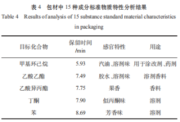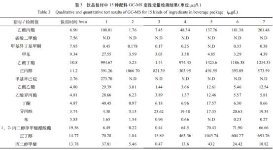 最先選用GC-MS對空缺試品、一切正常試品、出現(xiàn)異常試品中是不是含包裝材料中普遍的15種調(diào)料成分開展判定定性分析,能夠有比照掌握健康飲品包裝材料調(diào)料中添加物在飲料中總混狀況,從而分辨出現(xiàn)異??谖痘瘜W(xué)物質(zhì)造成的緣故;次之應(yīng)用數(shù)理統(tǒng)計方式對有關(guān)監(jiān)測數(shù)據(jù)信息分析,明確有象征性的試品用以GC-O嗅聞技術(shù)性科學(xué)研究。試品前解決后經(jīng)GC-MS判定定性分析檢驗,結(jié)果見表3。