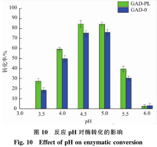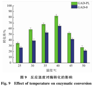 酶法制取GABA是一個(gè)不可逆反應(yīng),適合的氣溫能夠使GABA轉(zhuǎn)換率做到較大,因此 利用設(shè)定不一樣的酶轉(zhuǎn)換溫度來(lái)研究溫度對(duì)GABA轉(zhuǎn)換率的危害。以100g/L的磷酸為底物,溶解雙蒸水中,添加濕菌體(在55℃恒溫水浴鍋預(yù)備處理50min,改進(jìn)細(xì)胞的滲透性)30U/g,在150r/min的水浴搖床中開(kāi)展轉(zhuǎn)換,反映歷程中,操縱pH為5.0。溫度場(chǎng)設(shè)定為25、30、35、40、45、50℃,反映24h后停止反映并開(kāi)展燒開(kāi)解決,12000r/min離心式5min得上清液,適度稀釋液并過(guò)0.22μm有機(jī)濾膜完用HPLC-OPA柱前衍化法開(kāi)展檢驗(yàn),結(jié)果見(jiàn)圖9。轉(zhuǎn)換率隨環(huán)境溫度上升慢慢提升.當(dāng)轉(zhuǎn)換溫度做到40℃時(shí),GAD-0和GAD-PL轉(zhuǎn)換率做到最大,各自為64.78%和82.27%,再次上升溫度,轉(zhuǎn)換率反倒減少。這是由于枯草枯草芽孢菌植物細(xì)胞厚,而反映溫度過(guò)低時(shí),底物與胞內(nèi)酶液沒(méi)法充足觸碰促使轉(zhuǎn)換率低:當(dāng)反映溫度過(guò)高時(shí),酶與PLP可靠性差,進(jìn)而危害GABA的轉(zhuǎn)換率。