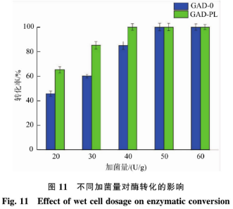 以100g/L的磷酸為底物,溶解雙蒸水中,添加預(yù)備處理過(guò)的不一樣濕菌體(20、30、40、50、60U/g),在40℃、150r/min的水浴搖床中反映24h,反映歷程中,操縱pH為5.0。反映完成后開(kāi)展燒開(kāi)解決,12000r/min離心式5min得上清液,適度稀釋液后用碳水化合物柱前衍化法開(kāi)展HPLC檢驗(yàn)。結(jié)果見(jiàn)圖11,資產(chǎn)重組菌全體細(xì)胞轉(zhuǎn)換率伴隨著加菌量的提高而逐步提升,在其中GAD-PL和GAD-0分別在40U/g和50U/g時(shí)將底物徹底轉(zhuǎn)換,轉(zhuǎn)換率做到100%。GAD-PL的加菌量低于GAD-0是由于前面一種體細(xì)胞巾的PLP成分高過(guò)后面一種,PLP做為第二信使有益于酶促反應(yīng)的開(kāi)展。