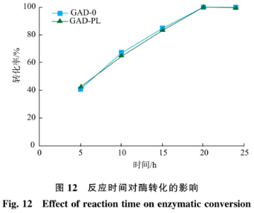 以100g/L的磷酸為底物,溶解雙蒸水中,添加預(yù)備處理過(guò)的不一樣濕菌體,GAD-0和GAD-PL添加量分別為50U/g和40U/g,在40℃、150r/min的水浴搖床中反映24h,反映歷程中,操縱DH為5.0。反映完成后開(kāi)展燒開(kāi)解決,12000r/min離心式5min得上清液,適度稀釋液完用HPLC-OPA柱前衍化法開(kāi)展檢驗(yàn),結(jié)果見(jiàn)圖12。在0~20h,GAD-0和GAD-PL轉(zhuǎn)換生成GABA的生產(chǎn)量隨時(shí)隨地問(wèn)增加快速提升,在20h時(shí)轉(zhuǎn)換率做到100%,以后伴隨著反映開(kāi)展,轉(zhuǎn)換率不會(huì)再產(chǎn)生變化。