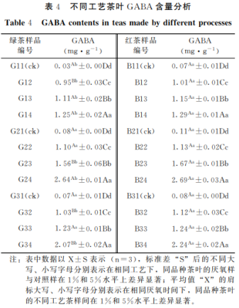 厭氧發(fā)酵時(shí)間對不一樣加工工藝荼葉的GABA成分剖析如表4所顯示,福鼎大白茶、白葉2號(hào)和黃金芽3個(gè)種類荼葉其對仍然的GABA成分很低,在綠茶和紅茶加工工藝中,其成分分別在0.03~0.08mg·g-1和0.07~0.11mg·g-1中間,隨厭氧發(fā)酵時(shí)間增加,3種普洱茶的GABA成分明顯提升,如綠茶葉加工工藝的黃金芽在厭氧發(fā)酵2、4、8h后,GABA成分各自達(dá)1.10、1.56、2.64mg·g-1,相比于對仍然各自上升了13.75倍、19.5倍和33倍;綠茶加工工藝的黃金芽在同樣厭氧發(fā)酵時(shí)間內(nèi)GABA成分各自達(dá)1.13、1.67、2.69mg·g-1,相比于對仍然各自上升了10.27、15.18、24.45倍,GABA聚集實(shí)際效果極其明顯,且發(fā)覺在二種加工工藝中,福鼎大白茶、黃金芽和白葉2號(hào)的GABA聚集量尺寸均表現(xiàn)為黃金芽>白葉2號(hào)>福鼎大白茶。同樣厭氧發(fā)酵時(shí)間內(nèi),發(fā)覺同種類茶青生產(chǎn)加工的綠茶加工工藝茶樣GABA成分明顯高過其綠茶葉加工工藝茶樣,剖析其根本原因可能是攤青全過程中,茶青體細(xì)胞堆密度提升,造成磷酸在厭氧發(fā)酵環(huán)節(jié)中脫羧反應(yīng)水平提高,轉(zhuǎn)換成GABA的成分較多。