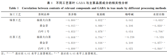 Pearson相關(guān)分析結(jié)果如表8所顯示,在厭氧發(fā)酵0~8h內(nèi),綠茶和紅茶二種加工工藝荼葉的首要質(zhì)量成份與GABA存有差異水平的關(guān)聯(lián)性。其關(guān)聯(lián)性尺寸整體均表現(xiàn)為,碳水化合物>茶氨酸>水浸出物>咖啡因,GABA與碳水化合物的關(guān)聯(lián)性較大,與茶氨酸和水浸出物大致呈極明顯負關(guān)聯(lián)性,與咖啡因的關(guān)聯(lián)性不明顯。綠茶葉加工工藝中,福鼎大白茶、黃金芽和白葉1號的碳水化合物成分與其說GABA聚集成分的關(guān)聯(lián)性尺寸先后為黃金芽(R=0.986)>白葉1號(R=0.878)>福鼎大白茶(R=0.852);在綠茶加工工藝中先后為黃金芽(R=0.936)>白葉1號(R=0.933)>福鼎大白茶(R=0.794)。融合2.2正斷層化剖析結(jié)果得知,在同樣厭氧發(fā)酵時間內(nèi),3種普洱茶的碳水化合物和GABA成分尺寸均展現(xiàn)為黃金芽>白葉1號>福鼎大白茶,荼葉GABA聚集量與碳水化合物成分正相關(guān),與相關(guān)分析結(jié)果一致,從而說明碳水化合物的含量高的油茶樹種類,其GABA的聚集實際效果不錯,油茶樹種類與GABA提高關(guān)聯(lián)性高低先后為黃金芽,白葉1號,福鼎大白茶。