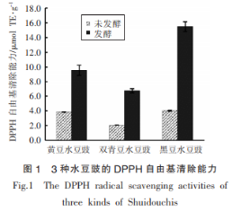 解木薯淀粉枯草芽孢菌CAUnDJ118發(fā)醇水豆豉的DPPH氧自由基消除工作能力由高到低為:大黑豆水豆豉(15.5μmolTE/g)、大豆水豆豉(9.5μmolTE/g)、雙青豌豆水豆豉(6.8μmolTE/g)(圖1)。與未發(fā)醇時(shí)對比,解木薯淀粉枯草芽孢菌CAUnDJ118發(fā)醇大豆、雙青豌豆、大黑豆水豆豉DPPH氧自由基消除工作能力各自提升了2.5,3.3,3.9倍。