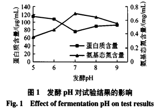 如圖所示1所顯示,在發(fā)酵時(shí)間和接種量一定的根基上,當(dāng)杜蠣培養(yǎng)液的pH為5~7時(shí),羥基態(tài)氮的成分呈持續(xù)上升發(fā)展趨勢,在pH為7時(shí)羥基態(tài)氮的成分超過了最大值,pH為7~8時(shí)羥基態(tài)氮成分稍有降低,pH為8~9時(shí)降低比較顯著,這有可能是由于納豆激酶枯草芽孢菌生長發(fā)育的適宜pH為7,并且納豆激酶在pH為7時(shí)納豆激酶蛋白激酶魅力最大。蛋白質(zhì)含量在pH為5~7時(shí)呈下降趨勢,從pH7~9則呈持續(xù)上升發(fā)展趨勢。很有可能與納豆激酶枯草芽孢菌產(chǎn)酶魅力降低相關(guān)。