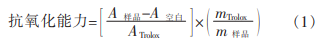 試品的抗氧化能力依據(jù)式(1)開展測算??寡趸芰χ狄訲roLox同樣抗氧化能力時的使用量(μMoLTroLox摩爾質(zhì)量/g)表明,即1g試品等同于TroLox的μMoL數(shù)。
