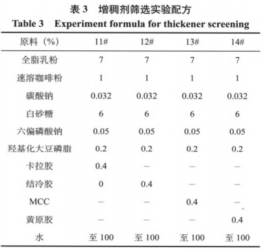 在牛奶咖啡飲品中增加一些增粘劑能夠提升牛奶咖啡飲品粘稠度,避免凝結(jié)沉積,平穩(wěn)牛奶咖啡飲品的管理體系。本試驗(yàn)選擇魔芋膠、結(jié)冷膠、MCC、卡拉膠四種常見增粘劑開展試驗(yàn),運(yùn)用可靠性檢驗(yàn)方式挑選出可靠性實(shí)際效果最佳的增粘劑。