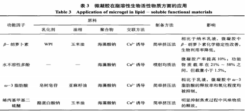 雖然脂溶性生物活性化學(xué)物質(zhì)在推動身體健康層面有著眾多好處,但其水溶差、有機化學(xué)可靠性低,限定了其在食物中的運用。保濕乳液添充微疑膠因為帶有乳化液滴,具有固定不動脂溶性生物活性成分的標(biāo)準(zhǔn),是一種相對性較新、具備潛在性使用使用價值的軟固態(tài)顆粒物。另一方面,根據(jù)調(diào)整保濕乳液添充微疑膠中油相的成分,使微疑膠相對密度盡量與周邊水相的一致,有益于降低比較大顆粒物微疑膠混液在作用力的作用下的分層次(下移或上調(diào))。一部分高聚物,如β-乳血蛋白和高密度蛋白,因為本身構(gòu)造上的特性(β-乳血蛋白表層帶有與DHA、維他命D2等脂溶性生物活性化學(xué)物質(zhì)融合的結(jié)構(gòu)域;密度低蛋白帶有親水性腔),不必附加油相的加入就可以用以脂溶性生物活性成分的固定不動。但單一的原材料,通常在生物活性成分的維護層面或自己的物理化學(xué)可靠性層面不能供應(yīng)充分的支撐點,現(xiàn)階段較常用的處理方法是根據(jù)靜電感應(yīng)絡(luò)合理合法于蛋白表層遮蓋一層陽離子含糖量,假如膠。這類管理體系已被運用于維他命D2、姜黃素等脂溶性生物活性成分的固定不動。除此之外,參考文獻中也報導(dǎo)了將這種脂溶性生物活性化學(xué)物質(zhì)(如花青素或β-胡羅卜素)以顆粒物(結(jié)晶)的方式包裹于(海藻酸鈣)微疑膠中。研究發(fā)現(xiàn),這種脂溶性顆粒物(結(jié)晶)可以在微疑膠產(chǎn)生全過程中(噴涌勻質(zhì)法)當(dāng)做“關(guān)鍵”,提升微疑膠的產(chǎn)出率。表3匯總了微疑膠在一部分脂溶性生物活性化學(xué)物質(zhì)層面的運用。