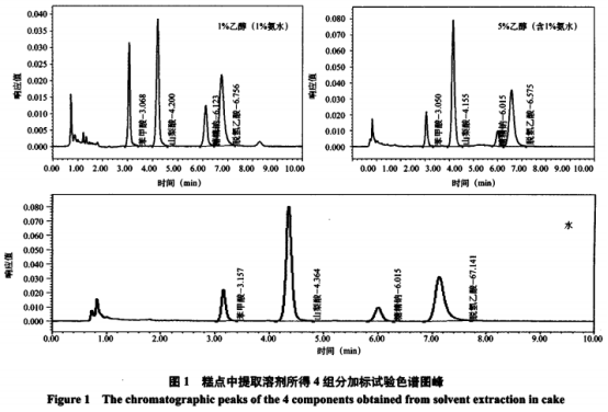 此次實驗沒有與此同時帶有4成分的呈陽性試品,挑選了呈陰性試品(點心)開展加標(biāo)實驗,調(diào)查了水、1%酒精(1%氫氧化鈉)、5%酒精(1%氫氧化鈉)、1%氫氧化鈉、5%工業(yè)甲醇(1%氫氧化鈉)、10%工業(yè)甲醇(1%氫氧化鈉)、水-乙酸鋅-氫氧化鈉溶液7種獲取有機溶劑對4成分峰的危害,稱量點心試品14份,每一種獲取有機溶劑平行面2份,高精密添加混和規(guī)范應(yīng)用液2.0mL,按試品(無奶油蛋糕或吐司面包、辣皮、月餅)2g于50mL具塞離心管架中,加5%酒精(含1%氫氧化鈉)獲取,50℃超聲波20min,制冷至室內(nèi)溫度,加219g/L亞鐵氰化鉀、106g/L乙酸鋅水溶液各2mL,渦流攪拌,于10000r/min離心式5min,上清液遷移至50mL容量瓶,沉渣再獲取一次,合拼2次滲瀝液,滴定劑至標(biāo)尺。