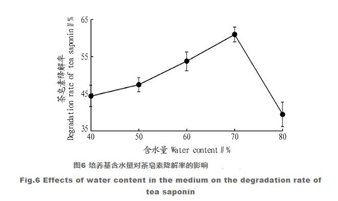 在以上挑選出的培養(yǎng)液秘方的根基上,更改培養(yǎng)液的水分含量,塑造后測量茶皂素成分并測算茶皂素溶解率,結(jié)果見圖6。從圖6能夠看得出,當(dāng)水分含量為40%~70%時,茶皂素溶解率伴隨著水分含量的提高而提升。當(dāng)水分含量為70%時茶皂素溶解率較大,做到60.97%;當(dāng)水分含量超出70%時,茶皂素溶解率明顯減少。茶籽餅遇水易凝固,水分含量過高的培養(yǎng)液易結(jié)團(tuán),菌體生長發(fā)育會得到抑止;當(dāng)水分含量過低時,培養(yǎng)液較為疏松,不可以給菌體給予適合的成長自然環(huán)境。固體培養(yǎng)基的水分含量是組成微生物菌種生長發(fā)育新陳代謝自然環(huán)境的主要要素,因而挑選70%做為培養(yǎng)液的較佳水分含量。