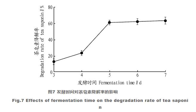 不一樣發(fā)酵時間對茶皂素溶解率的危害如圖所示7所顯示。從圖7能夠看得出,發(fā)醇前期伴隨著時間的提升,茶皂素溶解率逐步提升,當(dāng)發(fā)酵時間為5 d時茶皂素溶解率基本上不產(chǎn)生變化,即培養(yǎng)液歷經(jīng)5 d發(fā)醇后,茶皂素溶解率保持穩(wěn)定。因而,挑選5 d做為事后分析的發(fā)酵時間。