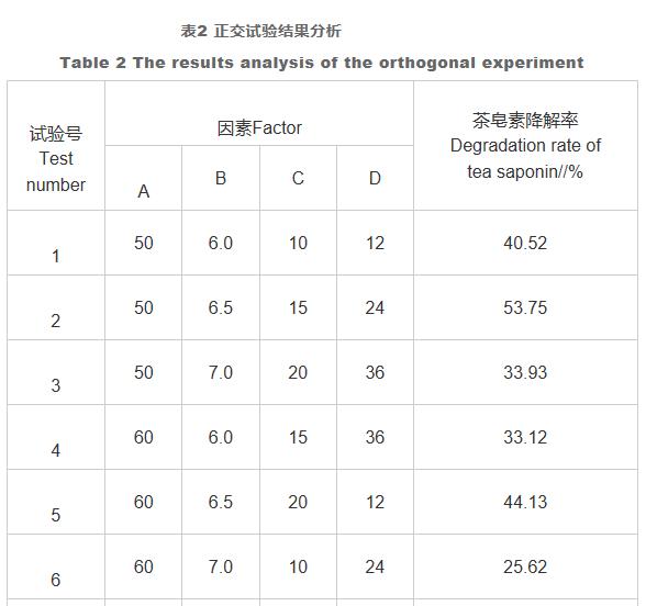 該實驗以茶籽餅為原材料,對茶籽餅微生物脫毒以及發(fā)醇加工工藝實現(xiàn)科學(xué)研究。根據(jù)單要素實驗和正交實驗調(diào)查了茶籽餅粕加上量、氮源、氮源、碳酸鹽類型及加上量、水分含量、原始pH、種齡、接種量、發(fā)酵時間等要素對茶皂素溶解率的危害,提升了發(fā)醇培養(yǎng)液的構(gòu)成及發(fā)醇標(biāo)準(zhǔn),最后獲得最好脫毒加工工藝標(biāo)準(zhǔn)。