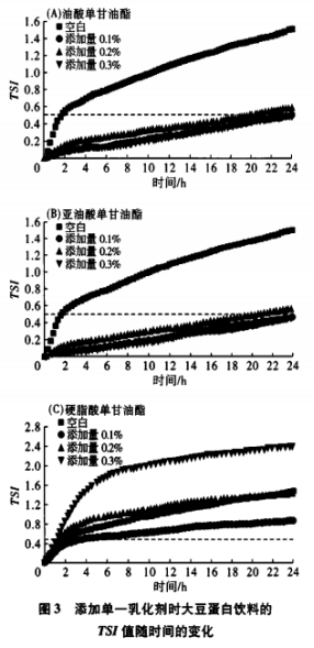 從圖3(A)和(B)能夠看得出,加上脂肪酸單甘油酯和脂肪酸單甘油酯的大豆蛋白粉飲品的TSI值較空缺試品有明顯減少,且在24h檢測(cè)時(shí)間內(nèi)絕大多數(shù)TSI值低于0.5,表明分散化系統(tǒng)的穩(wěn)定優(yōu)良,不穩(wěn)定狀況不顯著。而圖3(C)中,當(dāng)聚醚單甘油酯加上量為0.1%時(shí)TSI值較空缺試品小,可是當(dāng)加入量為0.2%和0.3%時(shí),大豆蛋白粉飲品的TSI值相對(duì)性于空缺試品而言更高,該結(jié)論與圖2(C)中試品頂端的背漫射光轉(zhuǎn)變的發(fā)展趨勢(shì)一致。