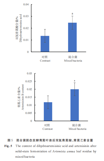 依據(jù)上述單一菌苗固態(tài)發(fā)酵青篙葉渣后粗蛋白、雙氫青篙酸、青篙乙素成分轉(zhuǎn)變結(jié)果,挑選酵母、乳酸菌及枯草枯草芽孢菌構(gòu)成混和菌,發(fā)醇青篙葉渣。如圖所示 4、圖 5 所顯示,青篙葉渣經(jīng)混和菌固態(tài)發(fā)酵后,粗蛋白成分提升了61. 73%(P<0. 05),雙氫青篙酸成分提升了82. 76%(P<0. 05),青篙乙素成分提升了69. 15%(P<0. 05)。混和菌固態(tài)發(fā)酵青篙葉渣作用成份成分提高明顯,為探尋青篙葉渣做為小動物飼料添加物的開發(fā)設(shè)計產(chǎn)給予理論創(chuàng)新。