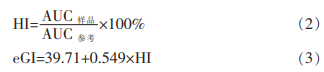 以淀粉水解率是縱軸,時(shí)間為橫軸制作試品水解反應(yīng)曲線圖。測算試品和規(guī)范食品類在0~180min期內(nèi)淀粉水解曲線圖下的面(AUC試品和AUC參照)。試品淀粉水解指數(shù)值(HydroIySiSindex,Hi)依照公式計(jì)算(2)測算。試品的eGi根據(jù)公