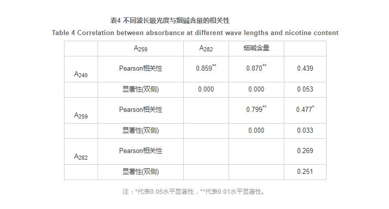 從表4中OD值與尼古丁成分的關(guān)聯(lián)性結(jié)果還可以看得出,尼古丁成分與240 nm關(guān)聯(lián)性貼近明顯水準(zhǔn),這是由于尼古丁在240 nm有紫外線消化吸收,但又有殘?jiān)绊憣?dǎo)致的;與259 nm處OD值關(guān)聯(lián)性做到明顯水準(zhǔn),這就是選用該方式基本原理所屬。尼古丁與282 nm處的OD值關(guān)聯(lián)性較弱,這是由于尼古丁在該點(diǎn)無消化吸收(圖1),其OD值是由于殘?jiān)挠绊憽6嚻匪芤涸?40、259和282 nm處的OD值中間呈極明顯關(guān)聯(lián)性,這正好表明殘?jiān)鼘@3個光波長處的OD值危害一致,這恰好是原公式計(jì)算創(chuàng)建的基本。