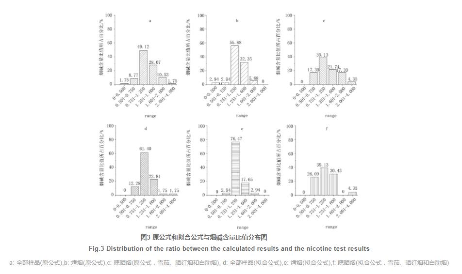 再各自以兩個公式計(jì)算對剩下5七個煙草試品尼古丁成分開展測算,隨后各自將數(shù)值除于HPLC檢驗(yàn)結(jié)果,則比率越貼近1表明檢驗(yàn)越精確。由圖3能夠看得出,所有試品的原計(jì)算公式結(jié)果與HPLC檢驗(yàn)結(jié)果的比率基本上呈標(biāo)準(zhǔn)正態(tài)分布,且在0.75~1.25的一部分占49.12%;而煙葉試品的比率在0.75~1.25的占55.88%,市場集中度略微提高;針對晾干煙試品,其比率也呈標(biāo)準(zhǔn)正態(tài)分布,但市場集中度較煙葉低,0.75~1.25的僅占39.13%。所有試品的線性擬合計(jì)算公式結(jié)果與HPLC檢驗(yàn)效果的比率基本上呈標(biāo)準(zhǔn)正態(tài)分布,0.75~1.25的占61.40%,高過原公式計(jì)算;煙葉試品的比率在0.75~1.25的占76.47%,市場集中度有大幅度提高;針對晾干煙試品其市場集中度較低,比率在0.75~1.25也是僅占39.13%,可是比率在0.5~0.75和1.25~1.60的各自由17.39%、21.74%提高至26.09%、30.43%。能夠看得出,兩個公式計(jì)算的結(jié)論均是煙葉市場集中度高過晾干煙,這是由于:1) 2種辦法的創(chuàng)建基本為煙葉,2) 晾干煙的雜物對OD值的影響有區(qū)別。