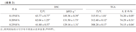 3和表4是加上FA和CA對(duì)面條蛋白質(zhì)熱學(xué)特性危害情形的結(jié)果。圖4為熱重分析的結(jié)果,在其中a和b各自意味著面條蛋白質(zhì)的TGA和DTG圖。由圖得知,與實(shí)驗(yàn)組對(duì)比,加上FA和CA后,熱溶解溫度(Td)明顯降低,而600℃時(shí)的熱損率明顯提高,均在加上量為0.25%時(shí)到達(dá)了最高值(FA為74.15%±0.04%,CA為74.79%±0.48%),表明加上FA和CA會(huì)使面條蛋白質(zhì)原來(lái)的構(gòu)造發(fā)生改變,越來(lái)越更加疏松,緊度減少。從圖5能夠看得出,伴隨著FA與CA加上量的上升,面條蛋白質(zhì)的熱轉(zhuǎn)性露點(diǎn)溫度(ΔH)、熱轉(zhuǎn)性溫度(Tp)均減少,在FA與CA的增加量為25%時(shí),面條蛋白質(zhì)的熱轉(zhuǎn)性露點(diǎn)溫度(ΔH)各自做到極小值,各自為(129.16±1.31)J/g和(148.60±0.69)J/g,Tp各自為(61.80±0.57),(55.38±0.95)℃。熱轉(zhuǎn)性溫度(Tp)是用以評(píng)價(jià)材料的分子結(jié)構(gòu)流通性和凝固水平的主要指標(biāo)值,熱轉(zhuǎn)性溫度減少代表著原材料產(chǎn)生解聚。結(jié)果能夠證實(shí),添加FA和CA促使面條蛋白質(zhì)的空間布局越來(lái)越疏松混亂。在DSC結(jié)果中,熱轉(zhuǎn)性露點(diǎn)溫度(ΔH)體現(xiàn)了原材料的吸水性與疏水性,從結(jié)論還可以看得出,伴隨著FA和CA加上量的提升,ΔH明顯減少,說(shuō)明面條蛋白質(zhì)的疏水性慢慢降低,這可能是因?yàn)槊鏃l蛋白質(zhì)內(nèi)部的水份市場(chǎng)競(jìng)爭(zhēng)造成其構(gòu)造進(jìn)行,即FA和CA的增加量會(huì)明顯危害面條蛋白質(zhì)的構(gòu)造。