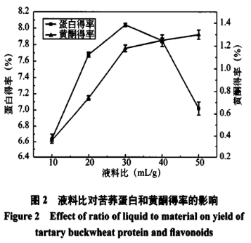伴隨著液料比的擴(kuò)大,苦養(yǎng)蛋白質(zhì)和黃酮類化合物、多糖類化學(xué)物質(zhì)提取率也隨著擴(kuò)大。當(dāng)液料比做到30∶mL/g時,苦蕎麥蛋白質(zhì)得率超過最高值為8.04%,黃酮類類物質(zhì)得率為1.18%。伴隨著液料比的持續(xù)提升,黃酮類得率逐步擴(kuò)大且發(fā)展趨勢輕緩,而苦蕎麥蛋白質(zhì)得率慢慢減少。因為液料比過使者萃取液濃度值過低,在酸沉全過程中水溶液中的蛋白質(zhì)和黃酮類化合物、多糖類化學(xué)物質(zhì)易外流在上清液中,乃至造成酸不沉析的狀況造成。從能耗等綜合性視角考慮到,液料比以30∶mL/g為宜。