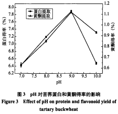 在偏堿情況下超聲波同歩獲取苦蕎麥蛋白質(zhì)和黃酮類化合物,伴隨著pH的擴(kuò)大二者的提取率也隨著擴(kuò)大,表明偏堿標(biāo)準(zhǔn)有益于苦養(yǎng)蛋白質(zhì)和黃酮類化合物的總混。當(dāng)pH為9時,蛋白質(zhì)得率超過最高值7.89%,黃酮類得率最高值1.12%。但伴隨著pH的再次擴(kuò)大二者的提取率均呈下降趨勢。這是由于苦蕎麥蛋白質(zhì)在強(qiáng)酸自然環(huán)境下能造成水解反應(yīng)、脫氨及其脫羧反應(yīng)等反映,危害理化性質(zhì),毀壞蛋白質(zhì)的功能,造成蛋白明顯轉(zhuǎn)性。pH過高就會直接影響商品顏色及其發(fā)生其它不良反應(yīng),在酸沉全過程中也會使水溶液中鹽份提升,產(chǎn)生鹽溶狀況。充分考慮產(chǎn)品成本及其環(huán)境保護(hù)等要素,采用pH為9的水溶液開展苦蕎麥蛋白質(zhì)和黃酮類化合物的較佳獲取標(biāo)準(zhǔn)。