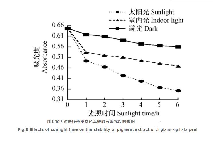 由圖8得知,當(dāng)外果皮黑色素萃取液在遮光、房間內(nèi)太陽(yáng)光及自然光直射標(biāo)準(zhǔn)置放時(shí),其OD值伴隨著存放的時(shí)間的提高而降低,在其中,在自然光直射情況下的降低最顯著,在遮光情況下的降低最少;且黑色素色調(diào)均發(fā)生變淡,自然光直射下變淡最顯著,而遮光下色調(diào)變淡較少。因而,鐵核桃外果皮黑色素光可靠性不佳,合適在遮光情況下儲(chǔ)存。