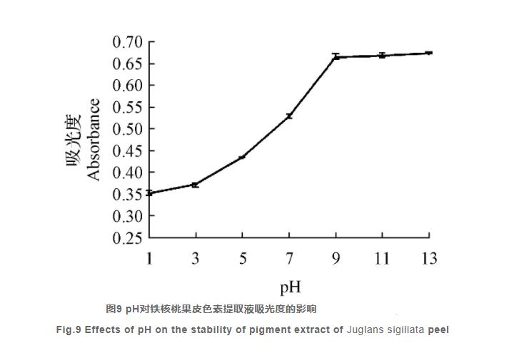 由圖9得知,伴隨著pH擴(kuò)大,外果皮黑色素萃取液的OD值持續(xù)擴(kuò)大,色調(diào)由黃棕色慢慢變成紅棕色最后變?yōu)樯詈稚?,與此同時(shí),在偏堿條件中也有小量沉積轉(zhuǎn)化成,這可能是因?yàn)殍F核桃仁外果皮黑色素會(huì)與堿產(chǎn)生化學(xué)變化。因此 ,該黑色素能夠依據(jù)具體色調(diào)必須,根據(jù)調(diào)整pH來(lái)達(dá)到,該結(jié)果與其他種類核桃仁黑色素的分析報(bào)導(dǎo)一致。
