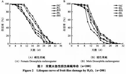 過氧化氫造成的氧自由基誘發(fā)家蠅造成氧化應(yīng)激損害。由圖2得知,枸杞子可以有效的增加家蠅生存時(shí)間,且伴隨著枸杞子濃度值的提升,家蠅均值生存時(shí)間逐漸增加。在其中,對(duì)比于紅枸杞組,褐變野生黑枸杞高使用量組家蠅均值生存的時(shí)間最多。雌、男性家蠅生長發(fā)育發(fā)展趨勢(shì)基本一致,且呈使用量相互依賴。雌蟲家蠅的均值生存時(shí)間高過同使用量組男性家蠅。