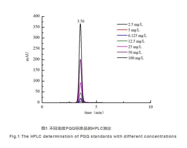 本試驗最先分析了別的離子交換柱檢驗PQQ,結果發(fā)覺一般C18柱沒法使PQQ合理保存,拆換流動性相工業(yè)甲醇和乙腈,或是是梯度方向過柱都不可以保存PQQ。此外發(fā)覺更改pH能夠使PQQ有一定的保存,但峰形較弱,且托尾比較嚴重,而且無法非常好分離出來試品發(fā)酵物中的PQQ。充分考慮PQQ正負極很大,因而選用耐100%水的COSMOSIL Packed Column 5C18-PAQ正相反離子交換柱來使PQQ有有效的保存。將準備好的七個不一樣含量的PQQ標準物質(100,50,25,12.5,6.125,5,2.5 mg/L)開展HPLC檢驗,每一個濃度值持續(xù)氣相3次,每一次氣相20 μ L。結果如圖所示1所顯示。不一樣含量的PQQ均在3.56 min上下出峰。伴隨著PQQ濃度值的提升,峰總面積也逐步提升。因而PQQ濃度值與峰總面積呈成正比的關聯。以PQQ濃度值為橫坐標軸,色譜儀峰總面積為縱軸,制作標曲,線性相關為y=30.27x 7.32,R2=0.9998,表明線性相關優(yōu)良。選用COSMOSIL Packed Column 5C18-PAQ正相反離子交換柱檢驗PQQ,運作時間較短,PQQ出峰時間早,檢驗高效率。本研究創(chuàng)建的HPLC法檢驗PQQ具備優(yōu)良的可行性分析,可做為菌苗產PQQ的復篩方式。