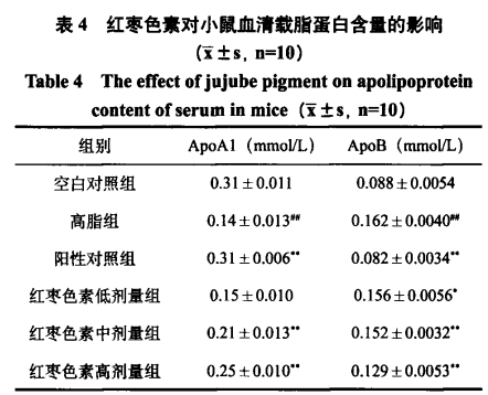 載脂蛋白可以融合和運(yùn)送血糖到人體各機(jī)構(gòu)開展新陳代謝及運(yùn)用,ApoA1是密度高的蛋白的具體構(gòu)造和功能蛋白成份,是主動脈粥樣硬化和心肌梗塞的保障因素,而ApoB含密度低蛋白數(shù)最多,是心肌梗塞的風(fēng)險(xiǎn)源,與主動脈粥樣硬化、心肌梗塞的發(fā)病率呈成正比。大棗黑色素對小白鼠血清蛋白載脂蛋白成分的干擾如表4所顯示,與空缺對照實(shí)驗(yàn)對比,高脂肪組小白鼠血清蛋白ApoA1成分降低54.84%,ApoB成分上升45.67%(p<0.01),說明高脂肪飲食搭配能使小白鼠患主動脈粥樣硬化和心肌梗塞概率提升。給與大棗黑色素干涉后,中、高使用量組小白鼠血清蛋白ApoA1成分上升50%、78.57%,小劑量組實(shí)際效果差別不明顯(p>0.05),低、中、高使用量組ApoB成分降低3.71%、6.17%、20.37%(p<0.05),且呈一定的量效關(guān)聯(lián),說明大棗黑色素能危害血糖新陳代謝和運(yùn)用,改進(jìn)脂代謝混亂,從而危害高血脂、主動脈粥樣硬化等病癥的產(chǎn)生。