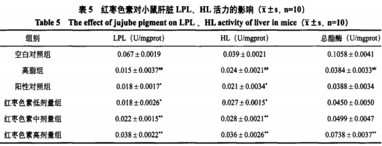 4、大棗黑色素對小白鼠肝部LPL、HL和總脂酶魅力的危害