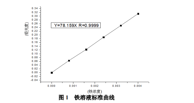 提前準(zhǔn)備 6 個 25 mL 的容量瓶,各自移取 0.00、2.00、4.00、6.00、8.00、10.00 mL 的 0.010 mg/mL 鐵的標(biāo)液,隨后再各自先后添加 5.0 mL 甲酸—醋酸鈉緩沖液、1.00 mL 抗壞血酸、2.00 mL鄰二氮菲水溶液,加滿水溶液后用純凈水溶解至標(biāo)尺線,混勻,大概置放 15 min 后于 510 nm 處測各水溶液的吸度,以純凈水做對照品,濃度值水溶液做空白試驗,扣減空缺水溶液OD值后,以O(shè)D值為縱軸,鐵濃度值為橫坐標(biāo)軸,制作規(guī)范趨勢圖,并測算出該趨勢圖的線形線性回歸方程及相關(guān)系數(shù)r。該試驗統(tǒng)計數(shù)據(jù)反映該曲線圖線形線性回歸方程為:Y=78.159X,線性相關(guān)指數(shù) R=0.9999,線性相關(guān)優(yōu)良。