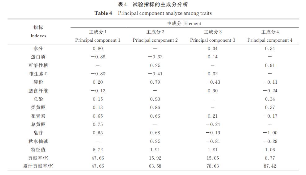對11種百合花的營養(yǎng)價(jià)值和作用質(zhì)量指標(biāo)值開展主成分分析法,以矩陣的特征值≥1為獲取主有效成分的規(guī)范,由表4得知,前4個(gè)主有效成分的總計(jì)標(biāo)準(zhǔn)差增長率做到87.42%,包含了全部測量指標(biāo)值。在其中,主成份1和主成份2的累積增長率63.58%,荷載值超過0.60的主要是作用指標(biāo)值包含原花青素、黃酮類物質(zhì)、人參皂甙、總酚、黃酮素等,將這類指標(biāo)值統(tǒng)一命名為作用因素。