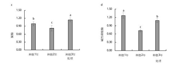 綿白糖酶能夠把高相對分子質(zhì)量的綿白糖轉(zhuǎn)化成綠色植物易消化吸收的小分子水的糖原,可以為土壤層生物給予充分的電力能源,提升生物活性。綿白糖酶促反應栽種3年較栽種1年和栽種2年對比酶促反應明顯降低(圖2b),且與C/N、C/P呈反比關聯(lián),表明綿白糖酶促反應可能是牽制土壤有機質(zhì)溶解與使用的要素之一。脲酶是營養(yǎng)物循環(huán)系統(tǒng)全過程主要的參加者,對營養(yǎng)物成分的變動主要表現(xiàn)比較敏感。本探究數(shù)據(jù)顯示(圖2c),重茬3年較重茬1年、重茬2年根際土壤層脲酶活力明顯上升,土壤層全氮和堿解氮也成提升發(fā)展趨勢,土壤層全氮和合理氮成分與土壤層脲酶呈成正比,說明蘭州百合短期內(nèi)重茬能夠帶來優(yōu)良的氮自然環(huán)境。夏品華等科學研究表明,人參重茬1~3年,伴隨著重茬期限的提升土壤層磷酸酶先減少后升高,這與本實驗科學研究結(jié)論一致。由此可見,重茬可以危害土壤層酶促反應,全過程繁雜。