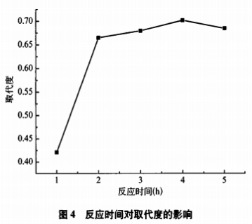 反應速度對羧甲基川番木瓜含糖量的取代度危害如圖所示4所顯示。由圖4得知,伴隨著反應速度提升,取代度先迅速提升,當反應速度為超出2h后取代度提升比較慢,從節(jié)省能源消耗的視角考慮到,反應速度應調節(jié)在3h上下為宜。