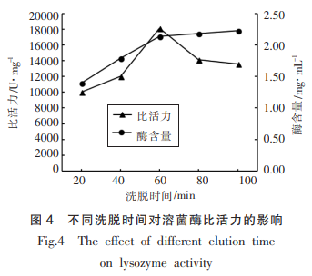 由圖4得知,當(dāng)過(guò)柱時(shí)間為60min時(shí),所得的溶菌酶的比魅力最大,伴隨著過(guò)柱時(shí)間再次增加,酶成分提升遲緩,酶比魅力反倒降低,綜合性考慮到資金成本費(fèi),選中過(guò)柱時(shí)間為60min。