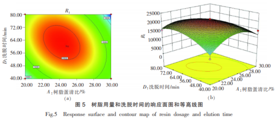 為了更好地獲得最大的溶菌酶比魅力,吸咐和過(guò)柱的各標(biāo)準(zhǔn)必須適合的交叉式挑選。響應(yīng)面圖可直接體現(xiàn)各要素及配對(duì)t檢驗(yàn)對(duì)酶魅力的危害,故取3項(xiàng)顯著性差異較高的交互項(xiàng)制做響應(yīng)面圖,依據(jù)圖5~7的Box-Behnken提升實(shí)驗(yàn)線性擬合回應(yīng)斜面圖和方差分析獲知,對(duì)溶菌酶比魅力危害尺寸次序?yàn)锳D>BD>AC。