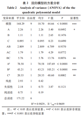 本試驗(yàn)回歸分析的調(diào)節(jié)明確指數(shù)R2Adj=0.9609,表明該實(shí)體模型能表述96.09%實(shí)驗(yàn)信息的特異性。此信息說(shuō)明,該實(shí)體模型擬合程度優(yōu)良,試驗(yàn)誤差相對(duì)性較小。失擬項(xiàng)P=0.1121>0.05,該試驗(yàn)變異系數(shù)C.V.%=10.87,由此證實(shí)可以用該實(shí)體模型方程式剖析和預(yù)測(cè)分析不一樣獲取情況下五味子含糖量得率。由表2得知A要素對(duì)五味子含糖量得率有極明顯危害,B要素危害十分明顯,次之是C要素危害,危害次序?yàn)椋篈>B>C。