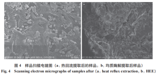 各自取3g預(yù)備處理試品,用勻質(zhì)酶解和熱逆流獲取五味子粗多糖,勻質(zhì)酶解提獲得率是10.01%,熱流回粗多糖提獲得率是7.13%,勻質(zhì)酶解獲取的提獲得率提升40.39%;勻質(zhì)酶解獲取時(shí)間2min,熱逆流獲取時(shí)間240min,時(shí)間減少了99.17%。為了更好地較為2種獲取技術(shù)的獲取高效率,對(duì)熱逆流獲取和勻質(zhì)酶解獲取后的試品機(jī)構(gòu)選用透射電鏡開(kāi)展了觀查,圖4(a)為熱逆流獲取后的五味子試品機(jī)構(gòu)的宏觀構(gòu)造,圖4(b)為勻質(zhì)酶解獲取后的樣本的宏觀構(gòu)造。從透射電鏡圖可觀測(cè)到熱流回4h后的五味子試品變大600倍時(shí),五味子組織細(xì)胞的宏觀構(gòu)造相對(duì)來(lái)說(shuō)較為詳細(xì),而將勻質(zhì)酶解獲取后的試品變大400倍,觀查到組織細(xì)胞的宏觀構(gòu)造有比較大水平的粉碎,這也是在高速分散機(jī)的強(qiáng)裁切和酶解的相同的作用下組織細(xì)胞有比較大水平的粉碎,有利于含糖量的迅速融解、蔓延,提獲得率大幅度提高、時(shí)間非常短、耗能減少。因而勻質(zhì)酶解得綠色植物活性多糖的獲取給予了一種高效率的翠綠色獲取技術(shù)性。