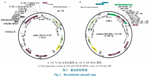 AT遺傳基因的兩個復(fù)制114與148過表達重組質(zhì)粒見圖3-A。AT遺傳基因的兩個復(fù)制114與148RNAi重組質(zhì)粒見圖3-B。