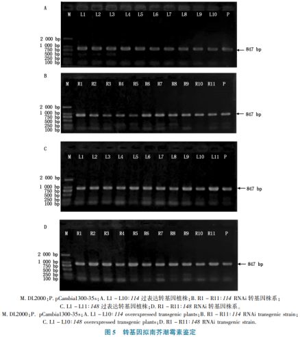 經(jīng)潮霉素挑選T0轉(zhuǎn)基因水稻擬南芥種籽后(圖4),對T1開展pCambia1300-35s-114、pCambia1300-RNAi-114、pCambia1300-35s-148及pCambia1300-RNAi-148媒介潮霉素評定,結(jié)果顯示(圖5),目地質(zhì)粒T-DNA均已插進擬南芥基因,說明擬南芥轉(zhuǎn)基因水稻取得成功。
