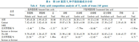 由表6得知,與野生型擬南芥種籽油酸各成份對(duì)比,影響148遺傳基因(148R)會(huì)造成脂肪酸成分提升,力度為31.19%,而軟脂酸、a亞麻酸會(huì)極明顯降低,而花生仁烯酸成分明顯降低,降低力度分別為5.46%,18.68%,13.16%,并使聚醚提升,脂肪酸和芥酸降低,可是調(diào)整力度沒(méi)有做到明顯水準(zhǔn),影響148遺傳基因還會(huì)繼續(xù)造成芥酸成分提升;過(guò)表達(dá)148遺傳基因(35s-148)會(huì)造成軟脂酸、脂肪酸、脂肪酸成分的極明顯提升,其提升力度分別為23.50%,45.12%,14.03%,而聚醚、a亞麻酸和花生仁烯酸的成分與野生型擬南芥對(duì)比,都是有極明顯的降低。