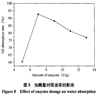 從圖8能夠看得出,在加酶量在5U/g~7U/g立即,伴隨著加酶量的提升吸油率擴(kuò)大;在7U/g做到吸油率最大,為92.76%。再次提升酶的添加量,吸油率反倒減少,在a-胃蛋白酶提升后,木薯淀粉顆粒物被水解反應(yīng)掉,變?yōu)樾☆w?;蚴?u>葡萄糖水分子結(jié)構(gòu),因此 吸油率減少。